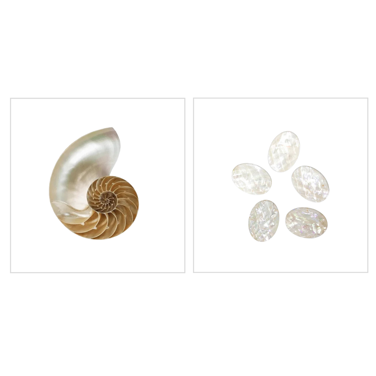 A concha natural Nautilus é muito popular pelo seu formato geométrico espiral. A concha possui uma camada brilhante e perolada, muito similar a madrepérola.