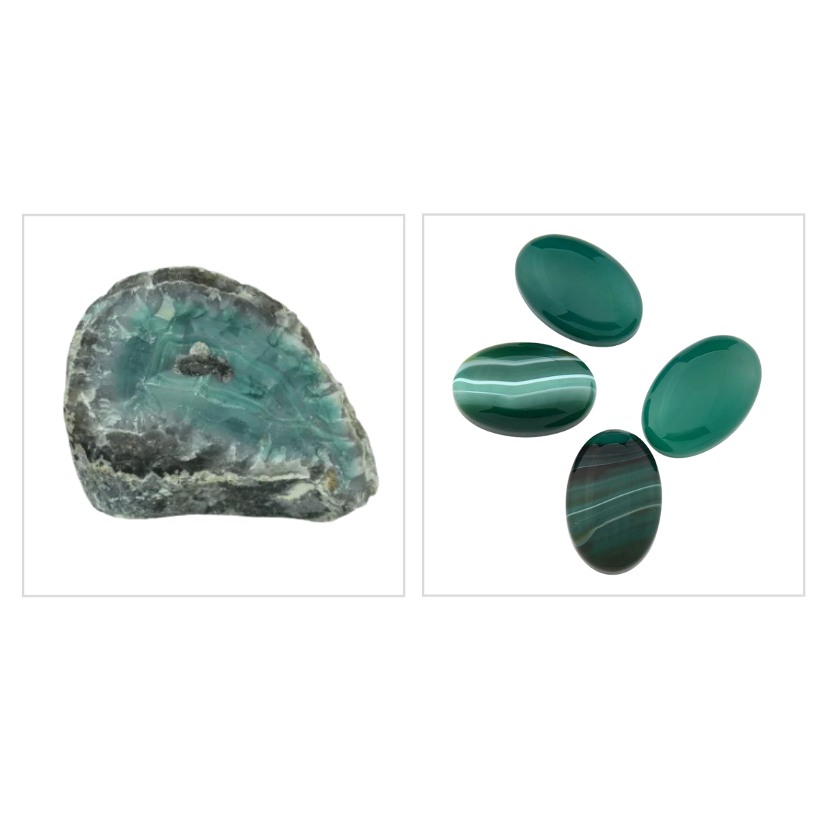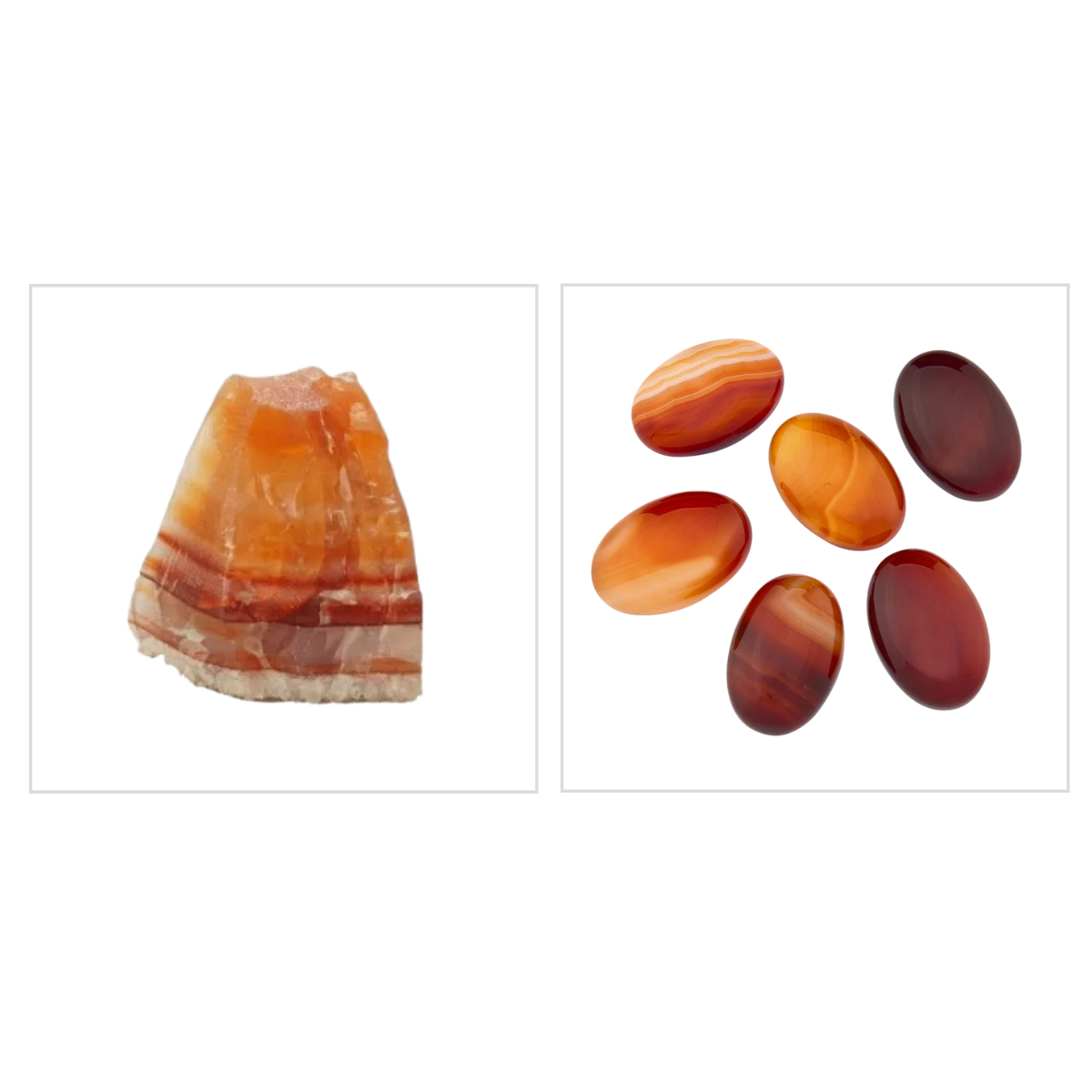 A ágata é uma calcedônia com faixas, ocasionalmente mesclada. As faixas podem ser de cores distintas ou também de um tom muito uniforme.