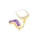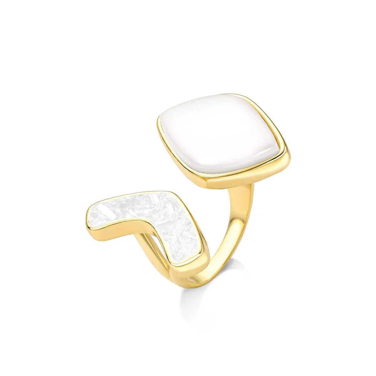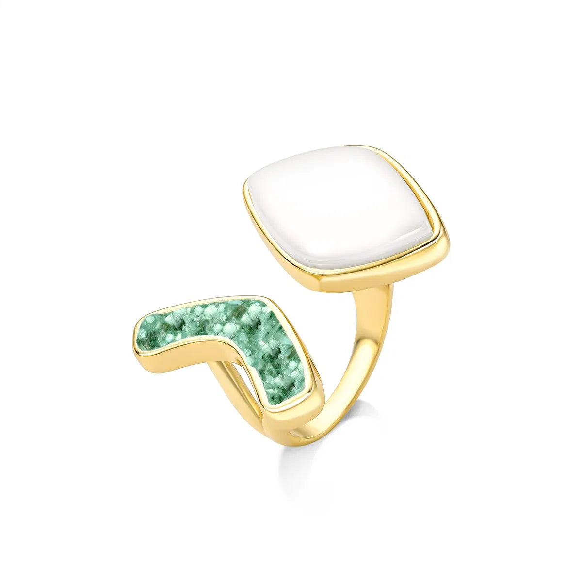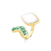 Detalhes do produto: • Anel regulável • Detalhes em pedras fragmentadas • Tamanho da pedra: cabochão formato folha 14x21mm • Folheado a ouro • Peça hipoalergênica / sem níquel • Garantia de 1 ano no banho Anel regulável com detalhe em pedras fragmentadas, que...