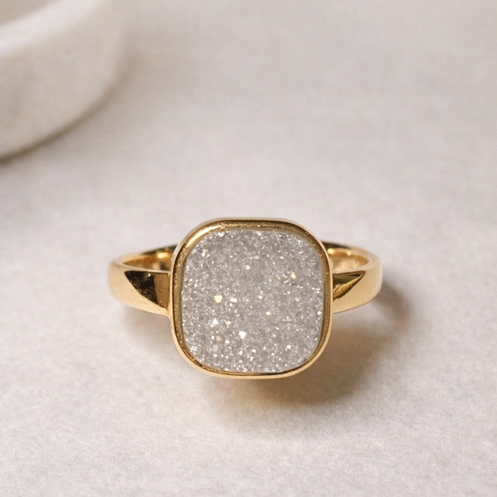 Anel de regulagem com pedra drusa em formato quadrado, que traz textura, brilho natural e um visual marcante. Uma peça moderna e elegante, perfeita para quem gosta de acessórios com presença e personalidade.