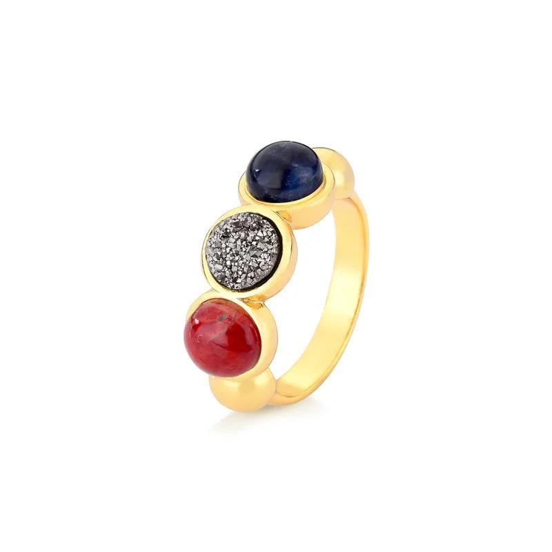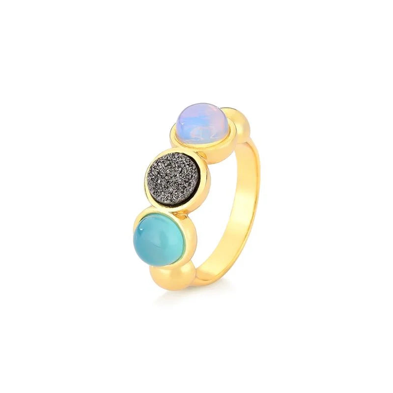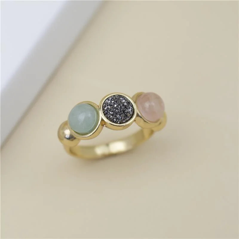 O Anel Zen Dourado é uma expressão de equilíbrio, luz e harmonia. Sua composição com três pedras naturais, sendo um cabochão e uma drusa no formato redondo de 6,5mm cria um contraste encantador entre o brilho intenso da drusa e a suavidade do cabochão.Com design delicado e contemporâneo, a peça traz versatilidade e sofisticação, perfeita para quem busca beleza com propósito e serenidade no estilo. Detalhes do produto:• Pedras cabochão e drusa redondas 6,5mm• Folheado a ouro• Peça antialérgica/hipoalergênica• Garantia de 1 ano no banho Uma joia que simboliza equilíbrio entre o brilho e a calmaria, ideal para quem deseja...