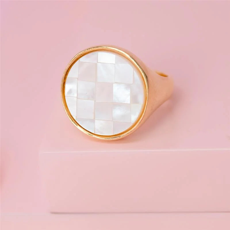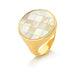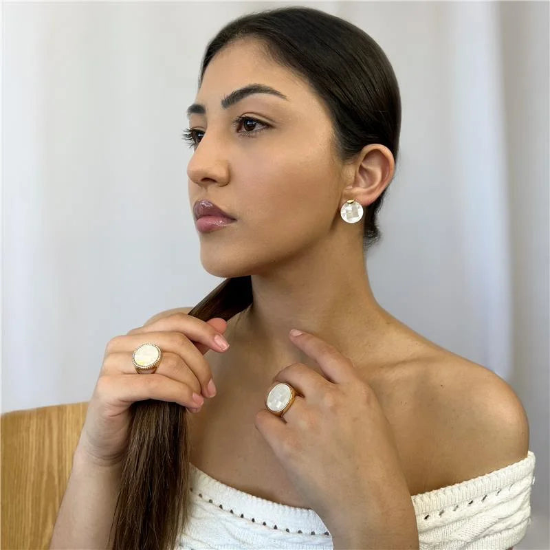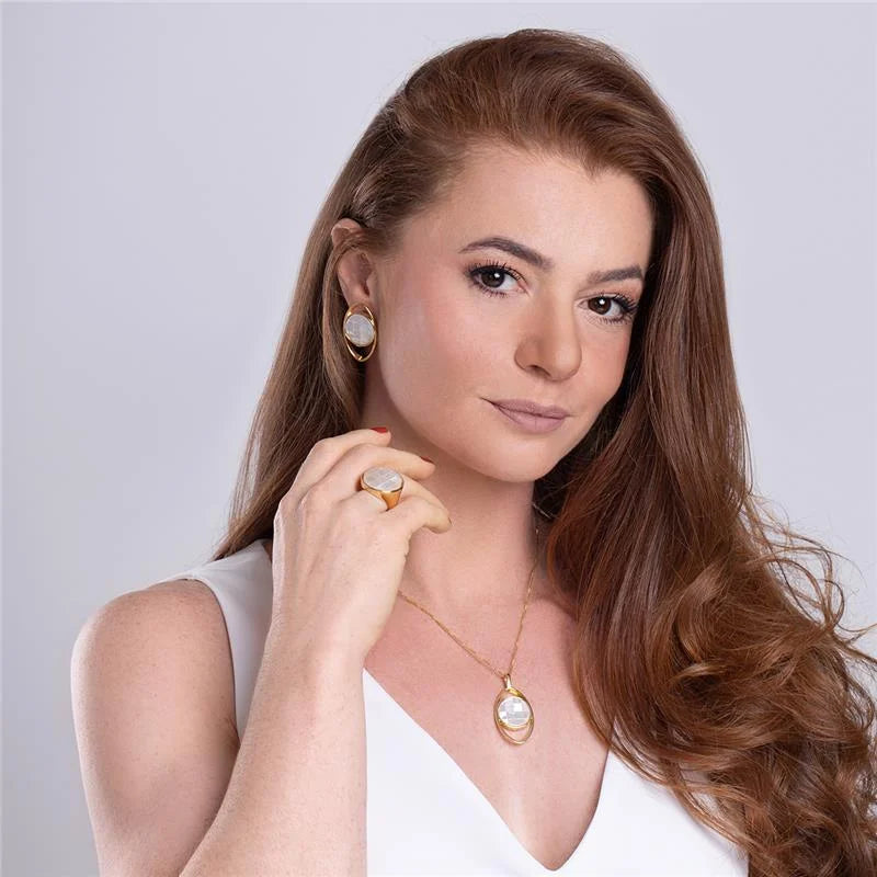 O Anel Dourado Madrepérola reflete a delicadeza e o brilho natural da luz em uma composição elegante e atemporal. Com pedra em formato redondo de 20mm, a peça destaca-se pelo seu design sofisticado e pelo reflexo perolado único da madrepérola, que transmite pureza, feminilidade e harmonia.Seu acabamento folheado a ouro realça o contraste suave entre o dourado e o tom nacarado da pedra, criando um visual refinado, versátil e perfeito para quem aprecia joias clássicas com toque moderno. Detalhes do produto:• Pedra madrepérola redonda 20mm• Folheado a ouro• Peça antialérgica/hipoalergênica• Garantia de 1 ano no banho Uma joia que traduz...