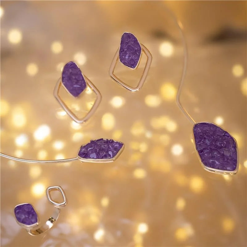 Brinco com pedra natural, extraída do interior de uma ametista, possuindo detalhes em Drusa, com formato retangular e tamanhos variados, as pedras variam de 1,5cm a 2cm. tornando-se assim uma peça única.Altura da base do brinco: 1,4cm.Altura total aproximada do brinco: 3,5cm