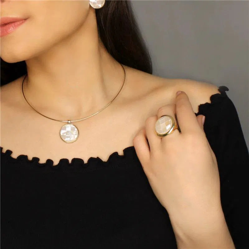 O Anel Dourado Madrepérola reflete a delicadeza e o brilho natural da luz em uma composição elegante e atemporal. Com pedra em formato redondo, a peça destaca-se pelo seu design sofisticado e pelo reflexo perolado único da madrepérola, que transmite pureza, feminilidade e harmonia.Possui detalhe dourado maior ao redor da base da pedra, delicado e sutil. Seu acabamento folheado a ouro realça o contraste suave entre o dourado e o tom nacarado da pedra, criando um visual refinado, versátil e perfeito para quem aprecia joias clássicas com toque moderno.Possui detalhe dourado maior ao redor da base da pedra, delicado e sutil. Detalhes...