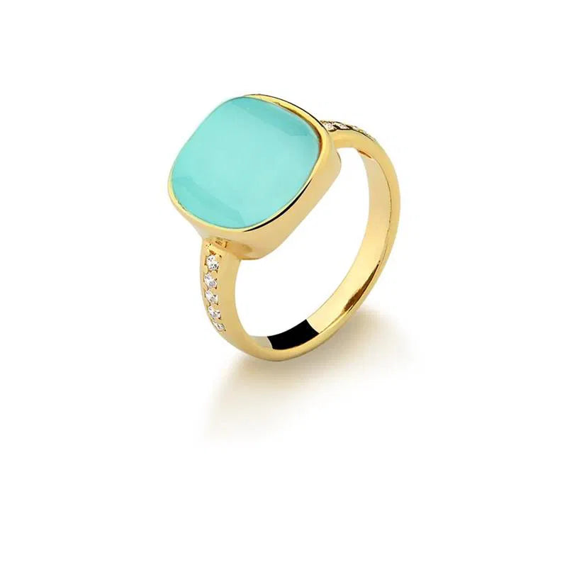 Detalhes do produto:• Pedra cabochão quadrada 1x1cm• Detalhe lateral com zircônias• Folheado a ouro• Peça hipoalergênica (sem níquel)• Garantia de 1 ano no banho