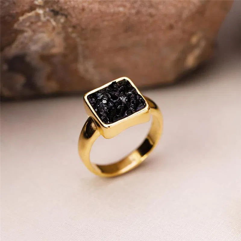 Este anel possui detalhes em pedras naturais fragmentadas, criando uma composição única em cada peça. As variações de cores e formas tornam cada anel exclusivo, trazendo autenticidade e personalidade ao design.