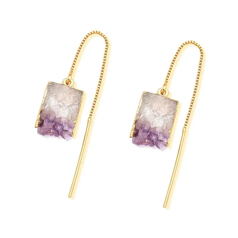 Brinco com pedra natural, extraída do interior de uma ametista, possuindo detalhes em Drusa, com formato retangular e tamanhos variados, as pedras variam de 1,5cm a 2cm. tornando-se assim uma peça única.Altura da base do brinco: 1,4cm.Altura total aproximada do brinco: 3,5cm