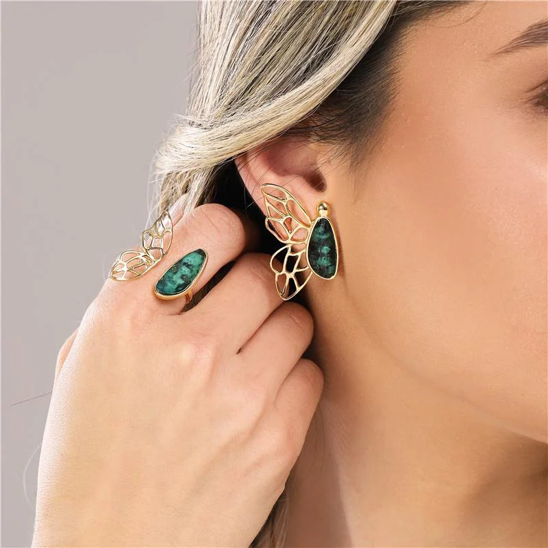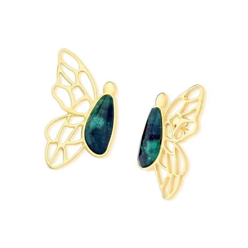BRINCO BORBOLETA ESMERALDA – COLEÇÃO GARDEN O Brinco Borboleta Esmeralda da Coleção Garden traz a delicadeza e o encanto da natureza em uma peça cheia de vida e brilho.Inspirado na leveza das borboletas, combina o tom vibrante da pedra esmeralda com o design artesanal e sofisticado, criando uma joia elegante e marcante.Perfeito para quem valoriza o frescor e a beleza das formas naturais. Detalhes do produto:• Altura total do brinco: 4cm• Tamanho da pedra: triângulo escaleno facetado 9x18mm• Folheado a ouro• Peça antialérgica / hipoalergênica• Garantia de 1 ano no banho Coleção Garden:Inspirada nas formas e cores da natureza, a...