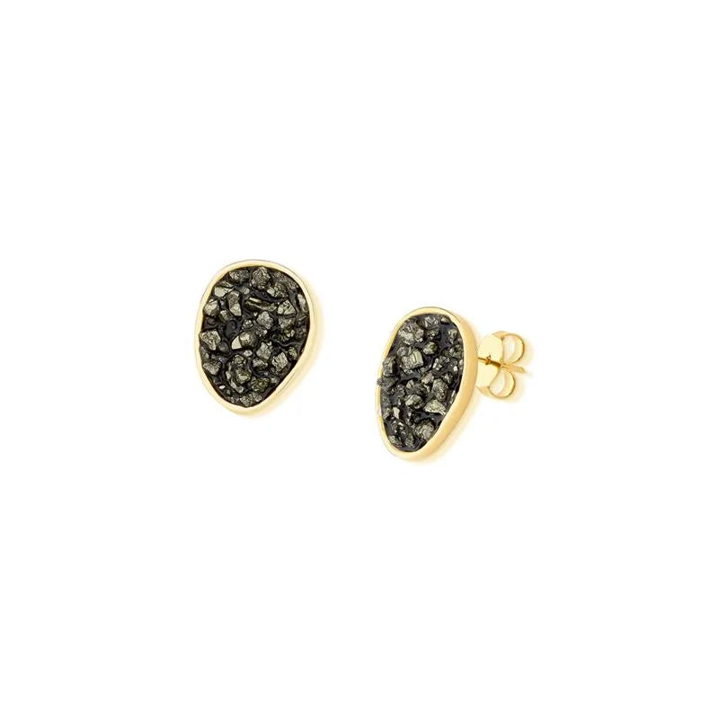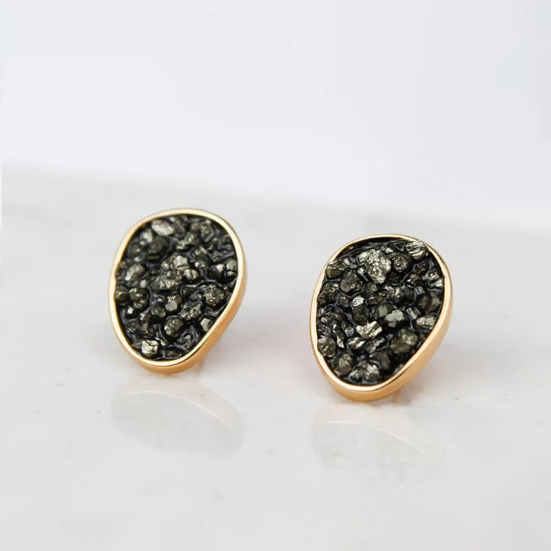 Brinco com pedra natural, extraída do interior de uma ametista, possuindo detalhes em Drusa, com formato retangular e tamanhos variados, as pedras variam de 1,5cm a 2cm. tornando-se assim uma peça única.Altura da base do brinco: 1,4cm.Altura total aproximada do brinco: 3,5cm