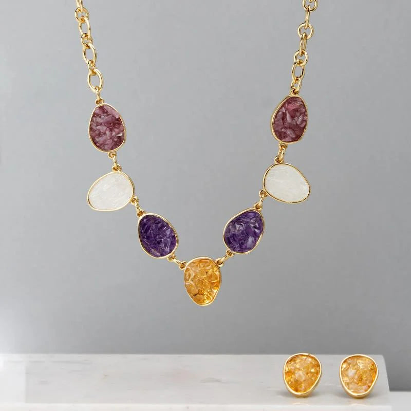 Da Coleção Lúmen / Fragmentos, o Conjunto Lúmen Aro Dourado é a união perfeita entre delicadeza e sofisticação natural.As pedras fragmentadas, com suas formas e cores únicas, tornam cada peça exclusiva, enquanto o aro dourado realça o brilho e o design artesanal característico da coleção.O...