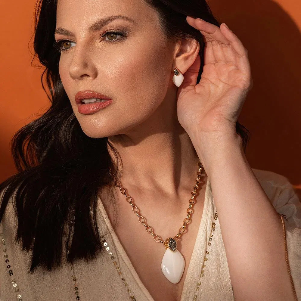 Detalhes do produto:• Altura do brinco: 2,4cm.• Altura do pingente: 5,2cm.• Tamanho do colar: 50cm.• Tamanho das pedras: – Pedra cabochão em formato de folha 14x21mm. – Pedra cabochão em formato de folha 28x42mm.• Peça com detalhes em pedras fragmentadas.• Porcelana perolada. Descrição:A Coleção Aura traduz a essência do boho chic em uma leitura moderna. Peças em porcelana perolada se unem à concha nautilus e às pedras fragmentadas, refletindo luz e texturas em formatos orgânicos. Mais do que acessórios, Aura é um convite para vestir liberdade, sentir elegância e revelar a força de uma estética boho que se reinventa a cada detalhe....