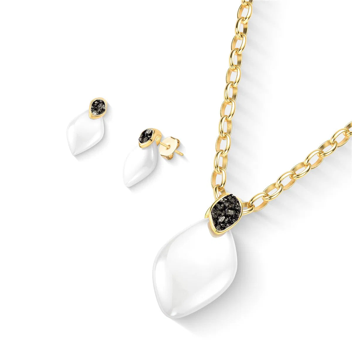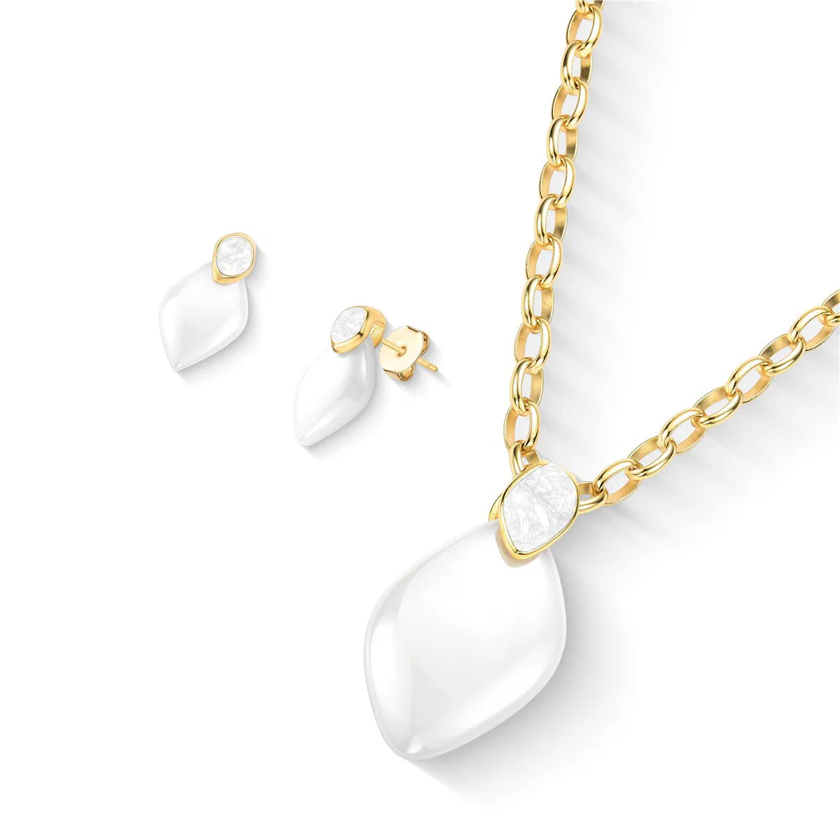 Detalhes do produto:• Altura do brinco: 2,4cm.• Altura do pingente: 5,2cm.• Tamanho do colar: 50cm.• Tamanho das pedras: – Pedra cabochão em formato de folha 14x21mm. – Pedra cabochão em formato de folha 28x42mm.• Peça com detalhes em pedras fragmentadas.• Porcelana perolada. Descrição:A Coleção Aura traduz...