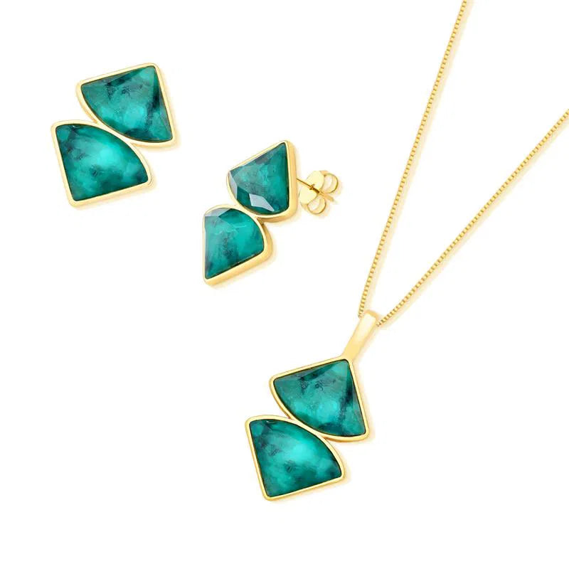 CONJUNTO DOURADO GEOMETRICO DUAS PEDRAS FACETADAS ESMERALDA