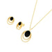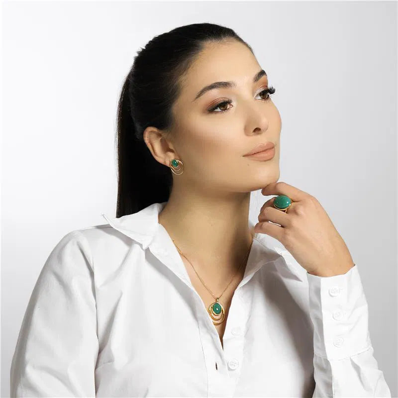 O conjunto é composto por brinco e pingente com pedra cabochão no formato oval, unindo delicadeza e sofisticação em um design atemporal.Com banho dourado e acabamento refinado, é perfeito para o dia a dia ou ocasiões especiais, trazendo elegância em cada detalhe.