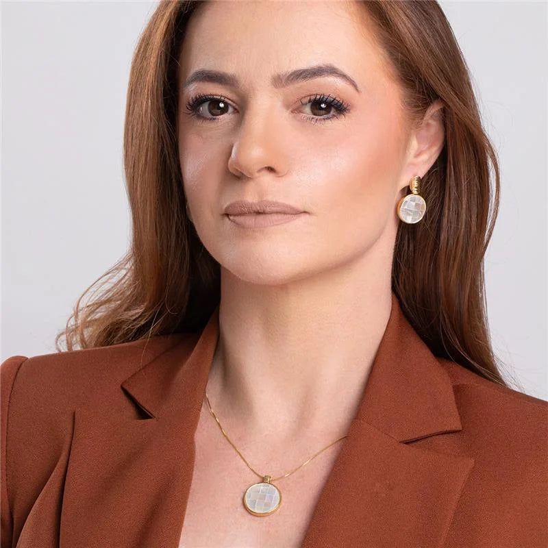 O Conjunto Mosaico traz um design sofisticado e atemporal, combinando delicadeza e brilho em cada detalhe.Acompanha um par de brincos redondo com detalhe dourado na parte do brinco, pingente e corrente veneziana, criando uma composição elegante e versátil para todas as ocasiões.