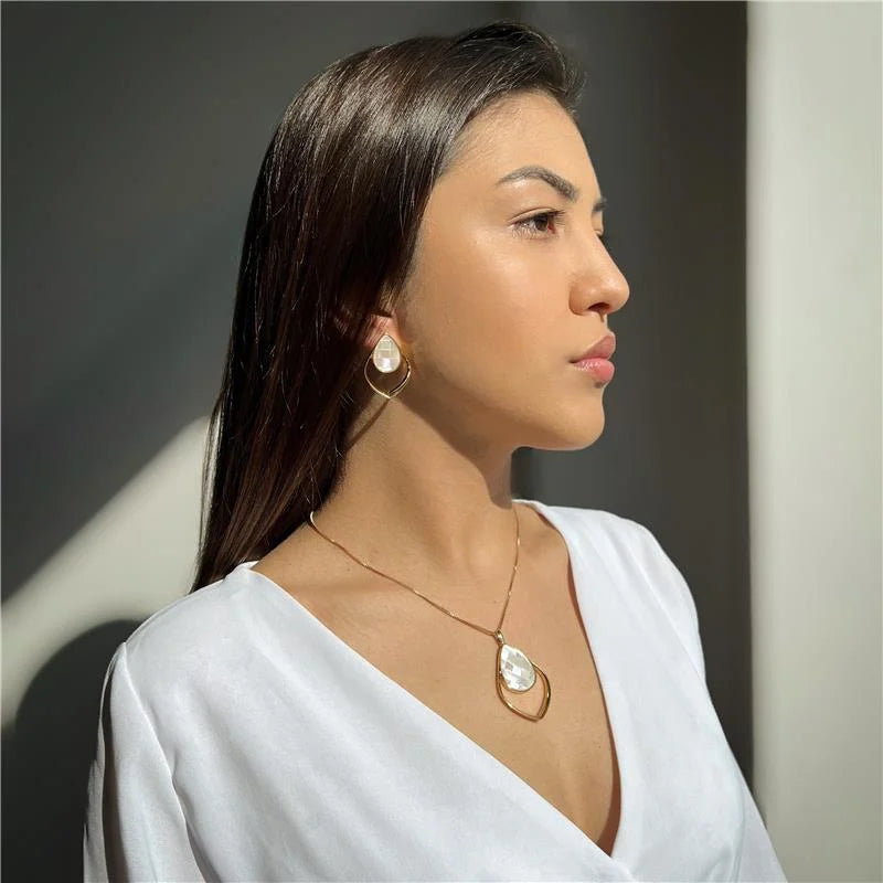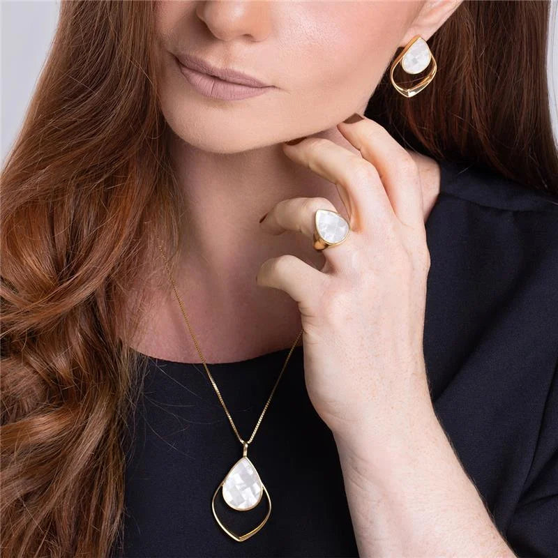 CONJUNTO MADREPEROLA FORMATO GOTA DETALHE DOURADO COLEÇÃO MOSAICO