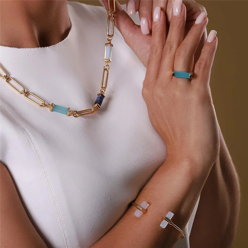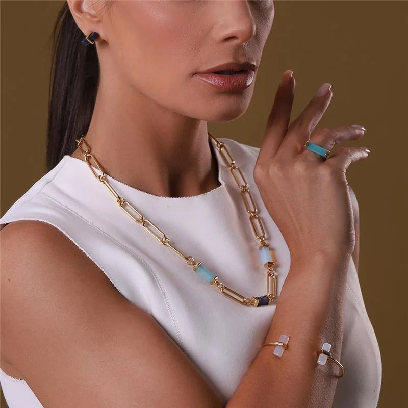 Da Coleção Lúmen / Fragmentos, o Conjunto Lúmen Aro Dourado é a união perfeita entre delicadeza e sofisticação natural.As pedras fragmentadas, com suas formas e cores únicas, tornam cada peça exclusiva, enquanto o aro dourado realça o brilho e o design artesanal característico da coleção.O...