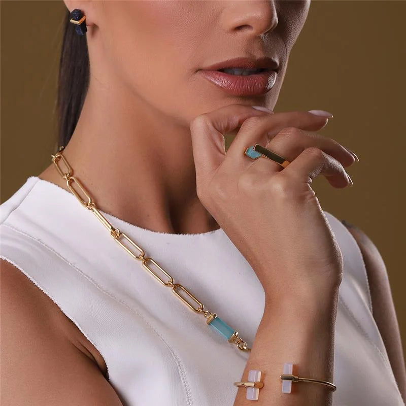 Bracelete Geométrico Este bracelete ajustável une sofisticação e estilo moderno. Folheado a ouro, possui acabamento de alta qualidade e brilho duradouro. Produzido com material hipoalergênico, garante conforto e segurança para todos os tipos de pele. O destaque está nas pedras naturais em formato retangular, posicionadas em cada extremidade do bracelete, conferindo um visual exclusivo e contemporâneo. Detalhes do produto: Folheado a ouro Material hipoalergênico Pedras naturais retangulares (contém duas pedras) Dimensão da pulseira: ajustável Garantia: 1 ano contra defeitos de fabricação As pedras podem apresentar pequenas variações, por serem naturais. Um bracelete moderno e elegante, perfeito para realçar sua beleza...